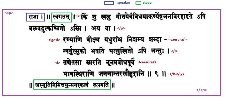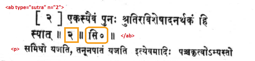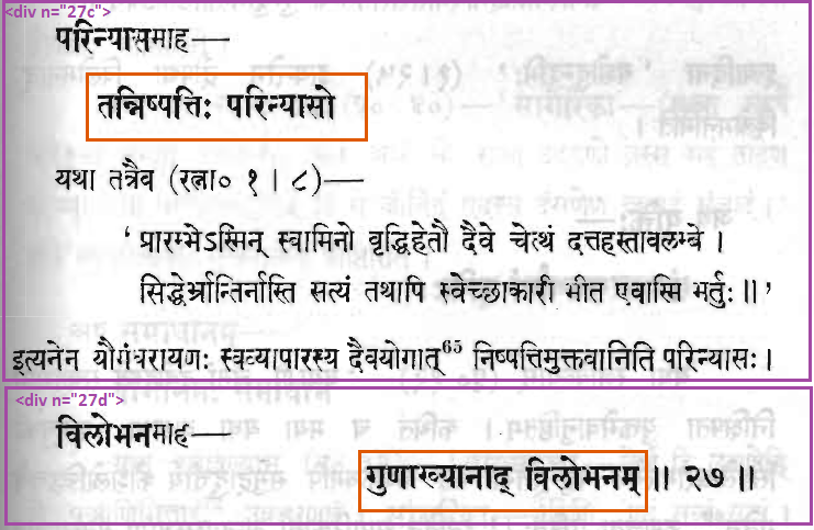 The particle इति, which marks quotations in Sanskrit, can be tricky: it often combines with the previous or following word, which can often mean that there is no typographic separation between a “verse” and the prose it’s embedded in. While there are ways of marking the beginning and ending of quotations, discussed more extensively in the SARIT Full guidelines, we don’t worry about quotations in SARIT Simple, and we are free to adopt the following straightforward principle: follow the typography of the printed edition.